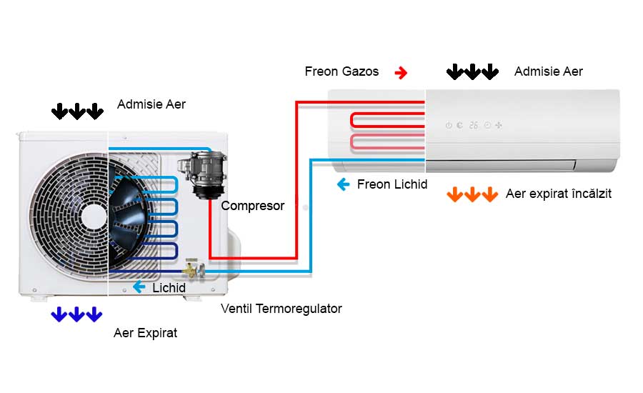 Ordinea de lucru a sistemului Split depinde de regimul selectat. După ce sistemul este pornit, compresorul începe să comprime aburul freon, ca urmare temperatură crește. Ulterior, vaporii de freon încălziți se deplasează la condensatorul din interiorul unității exterioare. După ce a fost eliminat excesul de căldură în exterior, freonul este condensat și alimentat la supapa de accelerație și apoi se evaporează în schimbătorul de căldură al unității interioare a aparatului de aer condiționat. Aceasta facilitează reducerea temperaturii sale și începe să capteze căldura din aerul din cameră și care se află în zona de intrare a compresorului. Ciclul se repetă. Supapă de expansiune specială poate modifica fluxul fluidului de lucru. Schimbând poziția acesteia, puteți ajusta capacitatea de răcire a aparatului de aer condiționat.